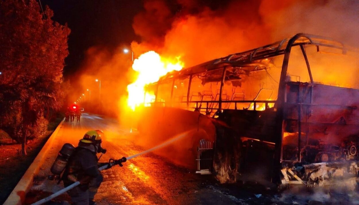 #Cancún, Quintana Roo.— Elementos del H. Cuerpo de Bomberos de Cancún atendieron de manera oportuna el incendio de un autobús de transporte del Valle, logrando controlar la situación y evitar riesgos mayores.